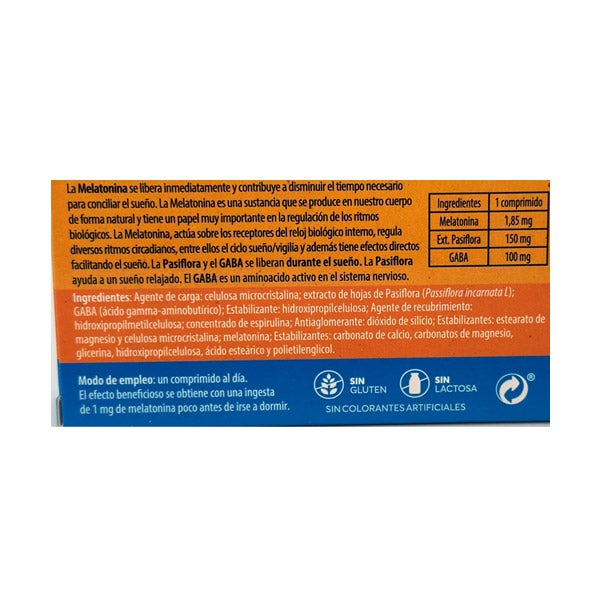 Agente de carga: celulosa microcristalina; extracto de hojas de Pasiflora (Passiflora incarnata L); GABA (ácido gamma-aminobutírico); Estabilizante: hidroxipropilcelulosa; Agente de recubrimiento: hidroxipropilcelulosa; concentrado de espirulina; anti aglomerante: dióxido de silicio; Estabilizantes: estearato de magnesio y celulosa microcristalina; melatonina, estabilizantes: carbonato de calcio, carbonatos de magnesio, glicerina; hidroxipropilcelulosa, ácido esteárico y polietilenglicol.