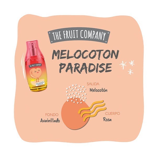 Disfruta de un verano lleno de encanto y deja que tu estilo brille con la nueva Eau de Toilette Melocotón Paradise The Fruit Company. Una esencia que te transportará directamente a un auténtico paraíso.