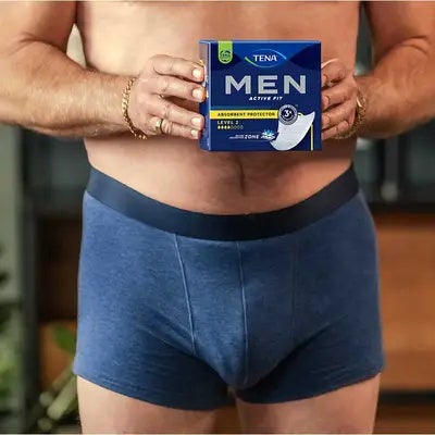 TENA Men Active Fit Level 2 es ideal para hombresque desean mantenerse activos y seguros, sin preocuparse por las pérdidas de orina. Su forma de copa asegura un ajuste seguro y cómodo, permitiendo una total libertad de movimiento.