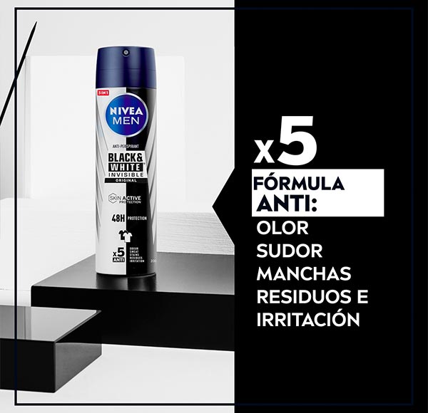 NIVEA MEN Black & White Invisible Original es un desodorante que proporciona una protección integral con 5 beneficios en un solo producto. Creado junto a los especialistas en tejidos del Instituto Hohenstein, esta línea garantiza un control eficaz de la transpiración mientras ayuda a evitar las MANCHAS, conservando el tono original de las prendas claras y oscuras. Neutraliza el OLOR gracias a su intensa fragancia, controla el SUDOR durante 48 horas de acción antitranspirante, no deja RESIDUOS sobre la piel ni en la ropa y minimiza las posibles IRRITACIONES gracias a una fórmula especialmente diseñada para el uso diario. En definitiva, es el aliado ideal para mantener la piel y la vestimenta protegidas en todo momento.