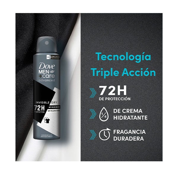 Dove Men+Care Invisible Dry es un desodorante antitranspirante en spray diseñado para mantener a raya el sudor y el mal olor hasta por 48 horas.