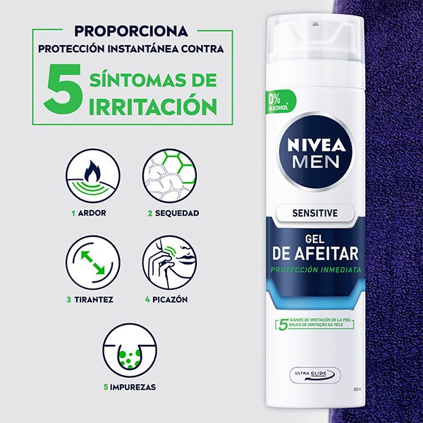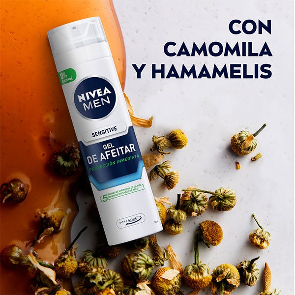 NIVEA MEN Sensitive Gel de Afeitar: proporciona una defensa eficaz frente a la irritación durante el afeitado en pieles sensibles. Su fórmula ultra suave sin alcohol, con extractos de Camomila y Hamamelis, incorpora la avanzada tecnología Ultra Glide que favorece un movimiento fluido de la cuchilla para lograr un resultado preciso y sin molestias. Prepara la piel para un afeitado cómodo y delicado: Sensitive Gel de Afeitar.