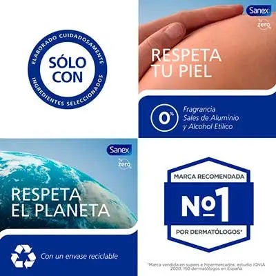 Características principales Sanex Men Zero% Respect &; Control desodorantesprayEste desodorante inhibe la formación de olores corporales gracias a ingredientes antibacterianos suaves, ralentizando la liberación de olores para una frescura duradera.
