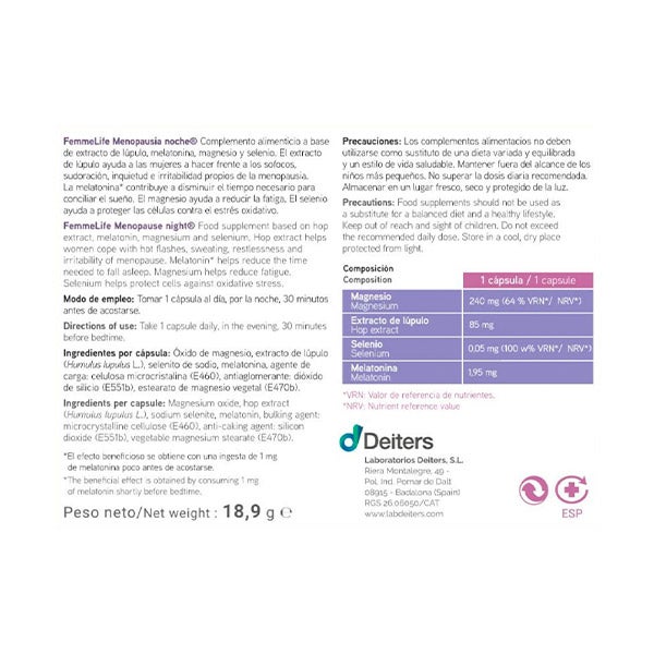 Ingredientes por cápsula: Óxido de magnesio, extracto de lúpulo (Humulus lupulus L.), selenito de sodio, melatonina, agente de carga: celulosa microcristalina (E460), antiaglomerante: dióxido de silicio (E551b), estearato de magnesio vegetal (E470b).