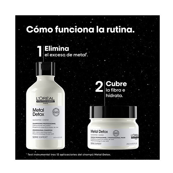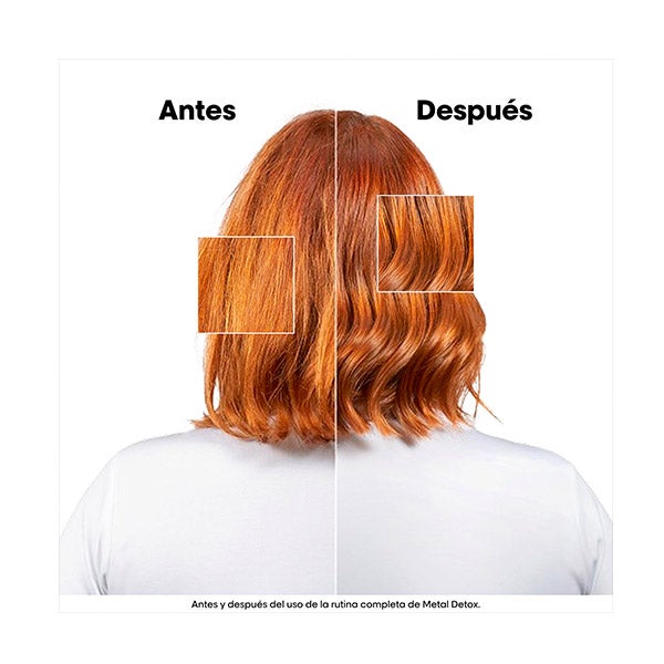 La mascarilla capilar Metal Detox (250ml) ayuda a proteger la fibra del cabello, evitando la acumulación de nuevos metales. El cabello se percibe con menos porosidad, más luminoso y con un aspecto saludable. Contribuye a prevenir la rotura y a conservar la intensidad del color. Ayuda a mantener la suavidad y el brillo del cabello, reduciendo el riesgo de alteraciones de tono tras procedimientos de decoloración, tinte o balayage.