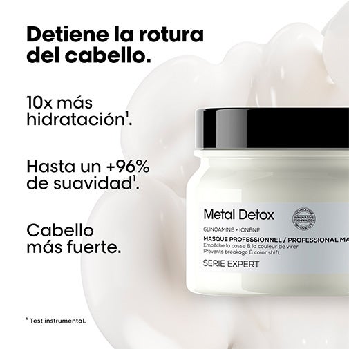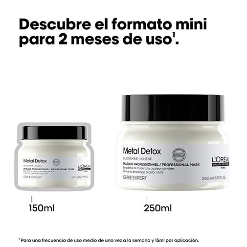 La Mascarilla Metal Detox representa un paso clave para mantener la salud y el color del cabello, ya sea teñido, aclarado o natural. Su fórmula de uso profesional contiene Glicoamina, una molécula patentada que localiza y neutraliza los metales presentes dentro de la fibra capilar, principales responsables de la rotura y de las alteraciones de tono.