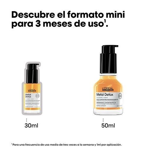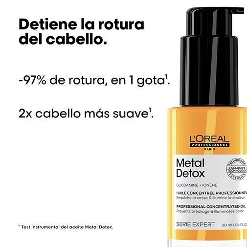 Fortalece tu melena, preserva la intensidad del color y potencia el brillo con el aceite protector concentrado Metal Detox, un tratamiento sin aclarado de uso diario que actúa desde el núcleo de la fibra capilar. Su fórmula profesional incorpora Glicoamina, una molécula diminuta capaz de detectar y neutralizar los metales presentes en el cabello, como el cobre, que tienden a acumularse con los lavados.
