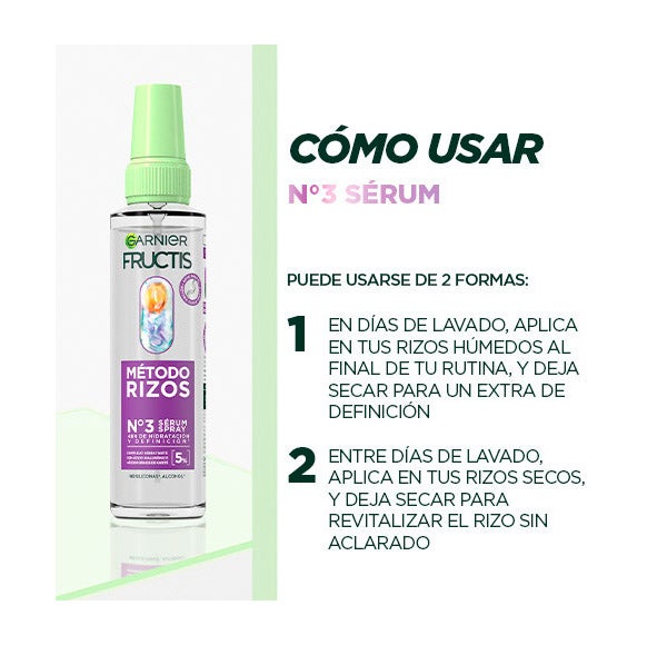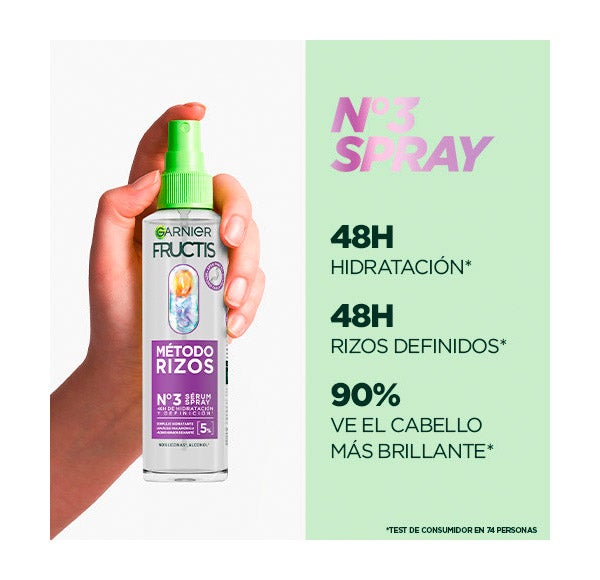 Descubre el nuevo Spray Serum capilar Garnier Fructis Método rizos, una línea que ayuda a mantener tus rizos más nutridos e hidratados gracias a la combinación de ácidos grasos de karité y un complejo con ácido hialurónico de acción humectante.