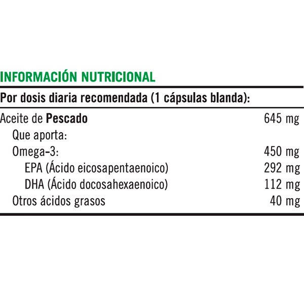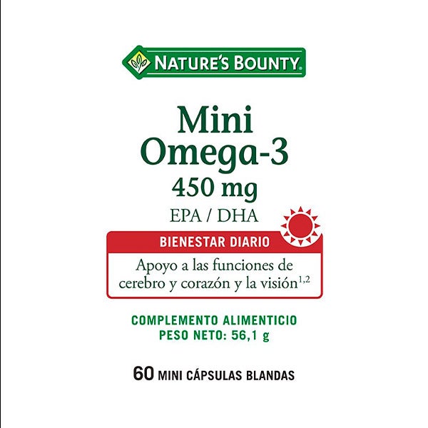 El complemento alimenticio Mini Omega-3 450 mg de Nature’s Bounty® contiene un aceite de pescado purificado y de alta concentración, formulado para aportar los ácidos grasos esenciales EPA y DHA en cápsulas blandas pequeñas que resultan sencillas de ingerir. 1El DHA y el EPA favorecen el funcionamiento normal del corazón. Este beneficio se obtiene con un consumo diario de 250 mg de EPA y DHA. 2El DHA contribuye a mantener el correcto desempeño del cerebro y la visión, efecto que se logra con una ingesta diaria de 250 mg de DHA.