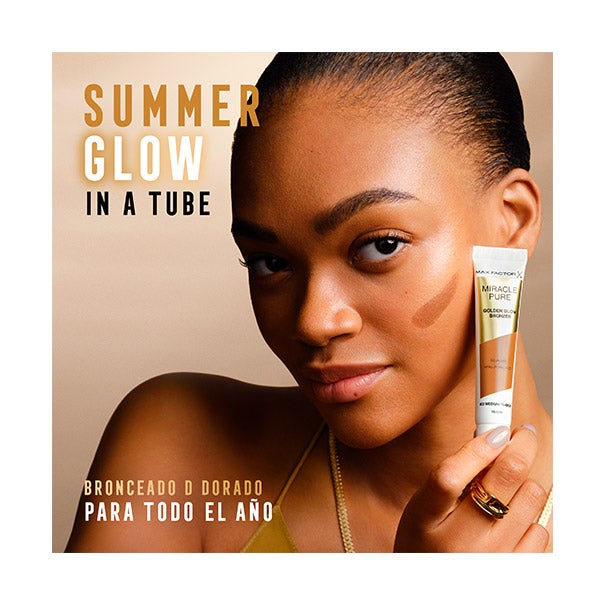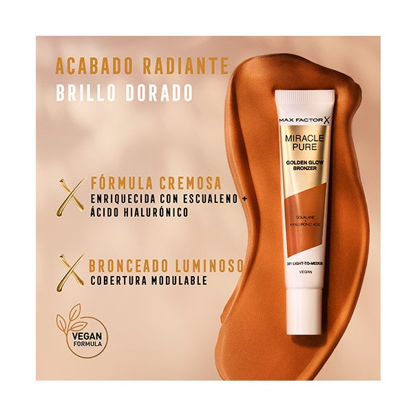 Consigue un brillo cálido de verano con el bronceador Max Factor Miracle Pure Golden Glow. Este bronceador cremoso y vegano combina escualano y ácido hialurónico para aportar un tono luminoso ajustable mientras mantiene la piel hidratada y cuidada. Con Miracle Pure Golden Glow, disfruta de un efecto dorado y radiante en cualquier época del año.