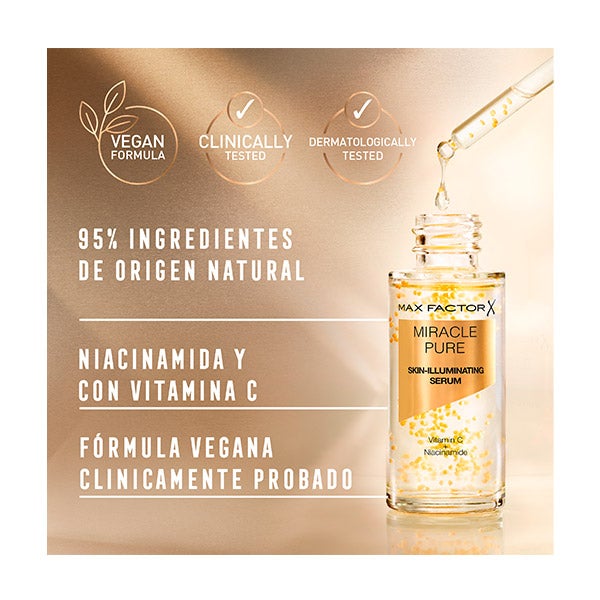 Max Factor introduce el innovador Miracle Pure Serum, un tratamiento facial que hidrata, aportando luminosidad y renovando las pieles secas o con aspecto cansado. Su fórmula 100% vegana concentra potentes activos como la Vitamina C y el Ácido Hialurónico, capaces de favorecer la generación de colágeno. Su flexibilidad de aplicación permite utilizarlo por sí solo, antes o incluso mezclado con la base de maquillaje, proporcionando un efecto visiblemente más luminoso. ¡Te encantará el resultado!