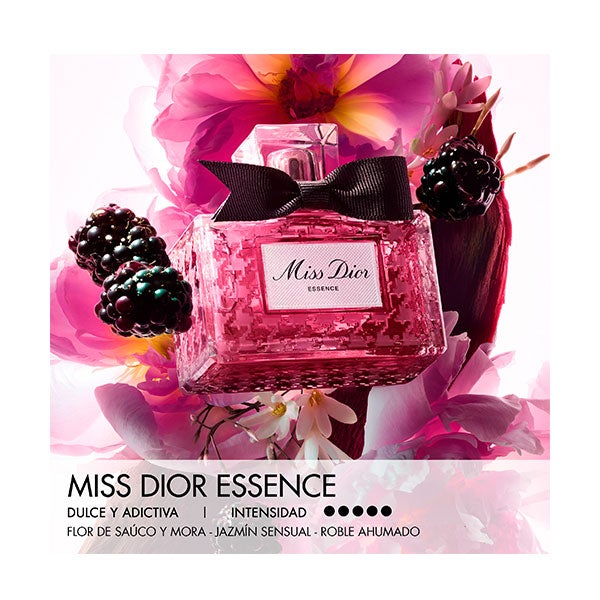 Miss Dior Essence cautiva por su contraste entre sorpresa y caricia: la mora confitada y la flor de saúco se alzan sobre un bouquet de jazmín de exuberancia ilimitada.
