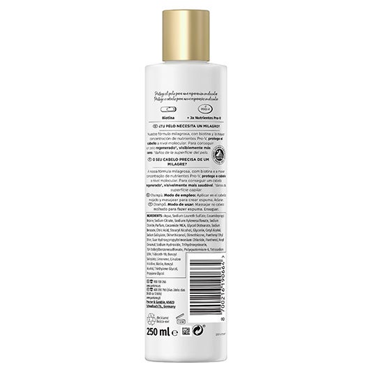 Aqua, Sodium Laureth Sulfate, Cocamidopropyl Betaine, Sodium Citrate, Sodium Xylenesulfonate, Sodium Chloride, Parfum, Cocamide MEA, Glycol Distearate, Sodium Benzoate, Citric Acid, Stearyl Alcohol, Glycerin, Cetyl Alcohol, Sodium Salicylate, Dimethiconol, Dimethicone, Panthenyl Ethyl Ether, Guar Hydroxypropyltrimonium Chloride, Panthenol, Hexyl Cinnamal, Sodium Hydroxide, Trihydroxystearin, TEA-Dodecylbenzenesulfonate, Polyquaternium-6, Tetrasodium EDTA, Trideceth-10, Benzyl Salicylate, Limonene, Linalool, Histidine, Biotin, Benzyl Alcohol, Triethylene Glycol, Propylene Glycol