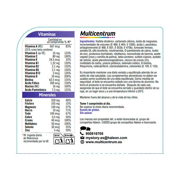 Fosfato dicálcico, carbonato cálcico, óxido de magnesio, incrementador de volumen (E 460, E 464, E 1200), ácido L-ascórbico, antiaglomerante (E 468, E 551, E 553b, E 470b), fumarato ferroso, acetato DL-alfa tocoferilo, nicotinamida, D-pantotenato de calcio, óxido de zinc, piridoxina clorhidrato, riboflavina, mononitrato de tiamina, aceite vegetal (coco y semilla de palma), beta-caroteno, sulfato cúprico, acetato de retinilo, ácido pteroilmonoglutámico, cloruro de cromo (III), molibdato de sodio, yoduro potásico, seleniato sódico, D-biotina, filoquinona, colecalciferol, cianocobalamina, colorantes (E 120, E 133).