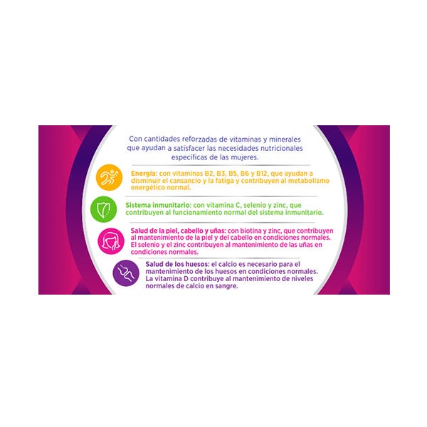 Cuenta con una fórmula especialmente diseñada y equilibrada que incluye vitaminas y minerales en proporciones ajustadas para contribuir a cubrir los requerimientos nutricionales femeninos.