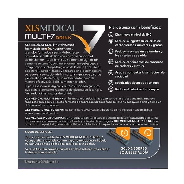 Toma 1 sobre soluble de XLS MEDICAL MULTI-7 DRINK dos veces al día, disolviéndolo en un vaso de agua y bebiéndolo 10 minutos antes de las comidas principales.