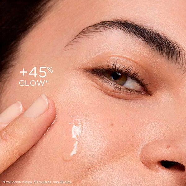 Tras 28 días de utilización: +45% luminosidad, +43% piel más lisa, +31% piel más uniforme.