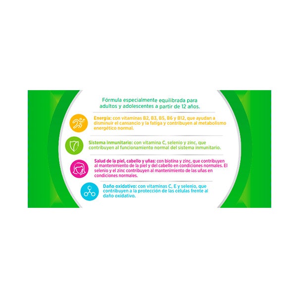 Suplemento nutricional con un equilibrio de vitaminas y minerales diseñado para cubrir las necesidades diarias de adultos y jóvenes mayores de 12 años.