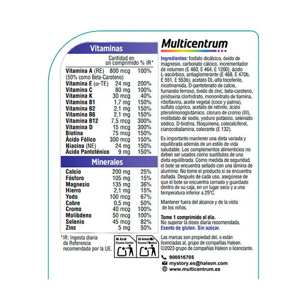 Fosfato dicálcico, óxido de magnesio, carbonato cálcico, incrementador de volumen (E 460, E 464, E 1200), ácido L-ascórbico, antiaglomerante (E 468, E 470b, E 551, E 553b), acetato DL-alfa tocoferilo, nicotinamida, D-pantotenato de calcio, fumarato ferroso, óxido de zinc, beta-caroteno, piridoxina clorhidrato, mononitrato de tiamina, riboflavina, aceite vegetal (coco y palma), sulfato cúprico, acetato de retinilo, ácido pteroilmonoglutámico, cloruro de cromo (III), molibdato de sodio, yoduro potásico, seleniato sódico, D-biotina, filoquinona, colecalciferol, cianocobalamina, colorante (E 132).