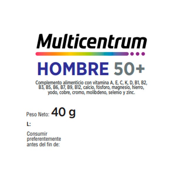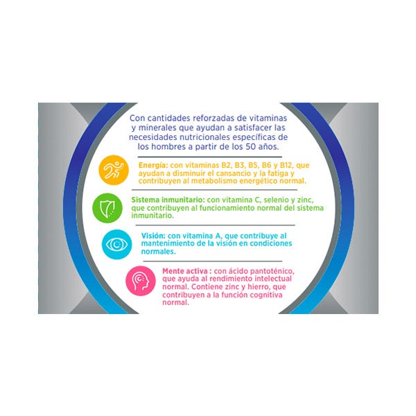 Multicentrum Hombre 50+ es un suplemento nutricional integral que combina vitaminas y minerales, diseñado específicamente para cubrir los requerimientos nutricionales de los hombres mayores de 50 años.