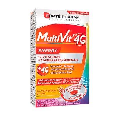 Multivit 4G Energy. Suplemento multivitamínico (12 vitaminas + 7 minerales) diseñado para mantener el bienestar físico durante toda la jornada, con el exclusivo complejo 4G (Ginseng, Guaraná, Jalea Real y Jengibre) que estimula la vitalidad y ofrece un extra de energía desde la mañana.