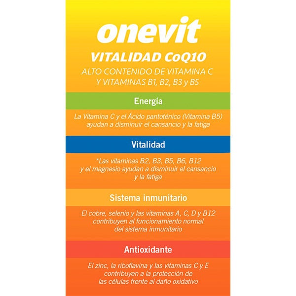 Onevit combina vitaminas, minerales y coenzima Q10 en una fórmula equilibrada diseñada para favorecer la vitalidad diaria, tanto en hombres como en mujeres.