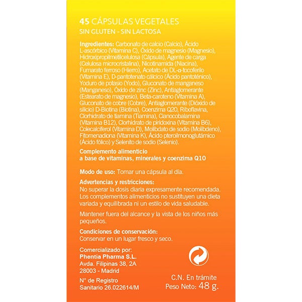 Carbonato de calcio (Calcio), Ácido L-ascórbico (Vitamina C), Óxido de magnesio (Magnesio), Hidroxipropilmetilcelulosa (Cápsula), Agente de carga (Celulosa microcristalina), Nicotinamida (Niacina), Fumarato ferroso (Hierro), Acetato de DL-α-tocoferilo (Vitamina E), D-pantotenato cálcico (Ácido pantoténico), Yoduro de potasio (Yodo), Gluconato de manganeso (Manganeso), Óxido de zinc (Zinc), Antiaglomerante (Estearato de magnesio), Beta-caroteno (Vitamina A), Gluconato de cobre (Cobre), Antiaglomerante (Dióxido de silicio) D-Biotina (Biotina), Coenzima Q20, Riboflavina, Clorhidrato de tiamina (Tiamina), Cianocobalamina (Vitamina B12), Clorhidrato de piridoxina (Vitamina B6), Colecalciferol (Vitamina D), Molibdato de sodio (Molibdeno), Fitomenadiona (Vitamina K), Ácido pteroilmonoglutámico (Ácido fólico) y Selenito de sodio (Selenio).