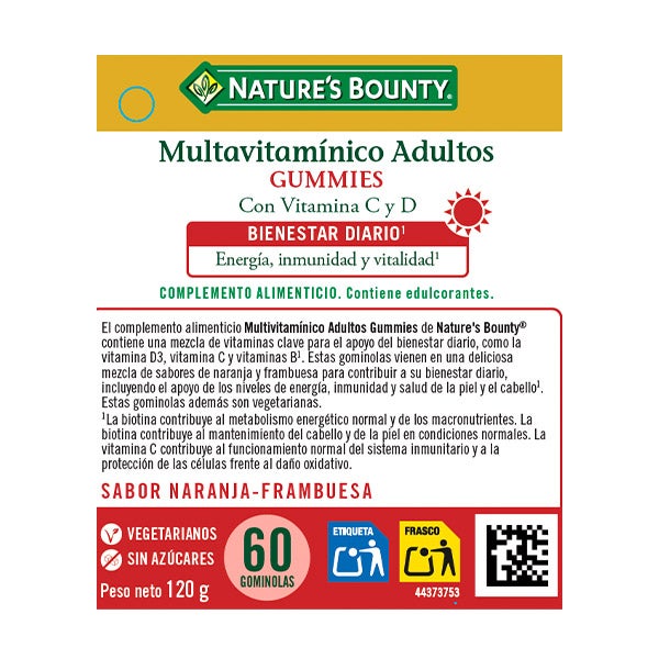 El suplemento nutricional Multivitamínico Adultos Gummies con Vitamina C y D3 de Nature´s Bounty® ofrece una combinación equilibrada de vitaminas esenciales diseñadas para favorecer el bienestar general, entre ellas vitamina D3, vitamina C y varias del grupo B.