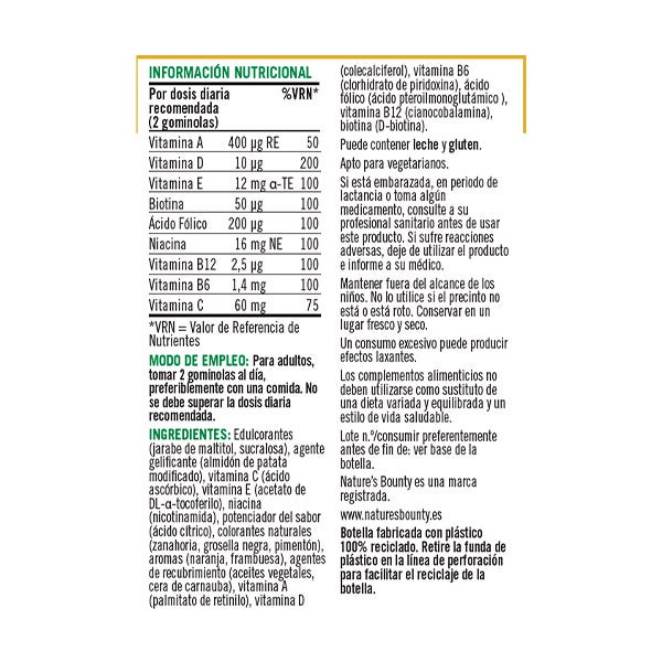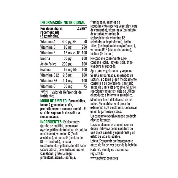 La ración de dos gominolas proporciona: vitamina C (como ácido ascórbico) 60 mg, niacina (como nicotinamida) 16 mg, vitamina E (como acetato de dl-alfa tocoferilo) 12 mg α-TE, vitamina B6 (como piridoxina HCl) 1,4 mg, vitamina A (como palmitato de retinilo) 400 mcg RE, ácido fólico (como ácido pteroilmonoglutámico) 200 mcg, biotina (como d-biotina) 50 mcg, vitamina D (como colecalciferol) 10 mcg, vitamina B12 (como cianocobalamina) 2,5 mcg.