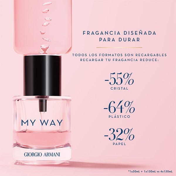 Este sofisticado perfume cuenta con un ingenioso frasco recargable que permite reponerlo cómodamente en casa. El recambio de My Way Eau de Parfum incorpora un diseño novedoso que facilita la recarga del vaporizador sin desperdiciar ni una gota de su aroma. Todos los tamaños de My Way (30, 50 o 90 ml) han sido concebidos para desenroscarse con facilidad y recargarse empleando el mismo frasco de recambio, de 150 ml, disponible dentro de su estuche individual.