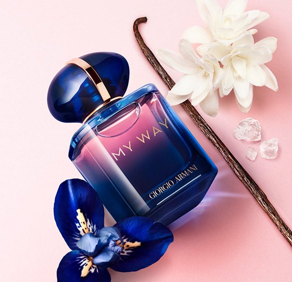 UN DISEÑO DE CONTRASTES INSPIRADORES El rediseñado frasco de My Way Parfum destaca por la armonía visual entre su tapón azul profundo y el jugo rosado vibrante, con una gradación de tonos que transita del azul oscuro en la base al rosa resplandeciente en el cuello. Estos matices reflejan la dualidad de la composición olfativa: el azul evoca la profundidad del Iris mientras que el rosa representa la luminosidad de la Tuberosa. El intenso tapón azul, símbolo del mundo, está realzado con un aro dorado que aporta elegancia y simboliza un viaje personal iluminado por cada experiencia.