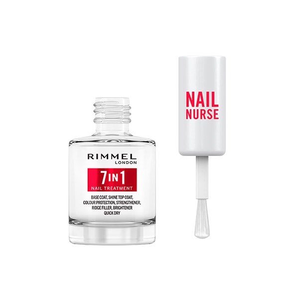 Cuidado integral para tus uñas con el esmalte Nail Care Multi Benefit 7 in 1 de Rimmel London, que protege y conserva el color. Una sola fórmula que reúne todos los beneficios esenciales: actúa como Base y Top Coat con brillo, ofrece defensa frente al desgaste del color, fortalece, rellena, realza el resplandor y se seca al instante. Puede aplicarse tanto como capa inicial o final, ayudando a alisar grietas y corregir irregularidades para una superficie lisa y lista para recibir el color.