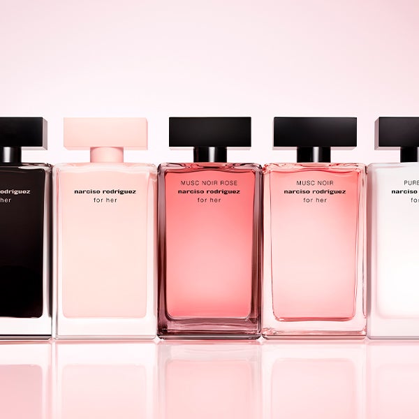 Experimente el arte de la estratificación con la colección clásica de perfumes For Her de Narciso Rodríguez.