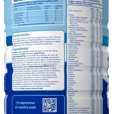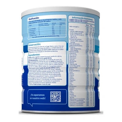 Leche de inicio indicada cuando la lactancia materna no es posible o es insuficiente, desde el primer día hasta el 6º mes. Contiene en su fórmula todos los nutrientes necesarios para el correcto desarrollo del lactante: Nucleótidos: favorecen el desarrollo del sistema inmunitario del bebé, participan en el crecimiento y desarrollo del tracto intestinal. DHA y AA: AGPICL presentes en la leche materna, que logran que los ácidos grasos en el plasma del bebé sean similares a los de los niños amamantados, participan en el desarrollo del SNC y en el desarrollo cognitivo del bebé, son eficaces para el correcto desarrollo de la función visual y regulan la respuesta inmunitaria. Prebióticos (GOS): que regula la flora intestinal, mejorando el tránsito intestinal gracias a su efecto de fibra dietética, favorecen las defensas naturales del bebé reforzando su sistema inmunitario y regulan los niveles de glucosa, lípidos y colesterol en la sangre. Tiene un agradable sabor y se disuelve fácilmente. Sin aceite de palma.
