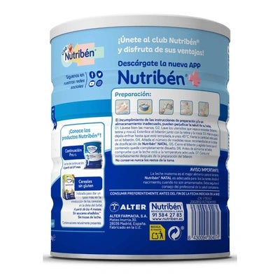 Beneficios de usar Nutriben Natal 1 Leche Para Lactantes. Tu bebé obtendrá las vitaminas y nutrientes que necesita para crecer saludable. Pediatras del mundo recomiendan este producto para el inicio de la alimentación de bebés. Cada uno de los ingredientes de este alimento ha sido estudiados y controlados desde el inicio del proceso de fabricación. Está compañía garantiza productos de calidad, vitamínicos y nutrientes, totalmente inofensivo para bebés. Alter farmacia, creadores de Nutribén cuentas con más de 60 años de experiencia en el mercado. Son generaciones de niños sanos y fuertes que Nutribén ha alimentado.