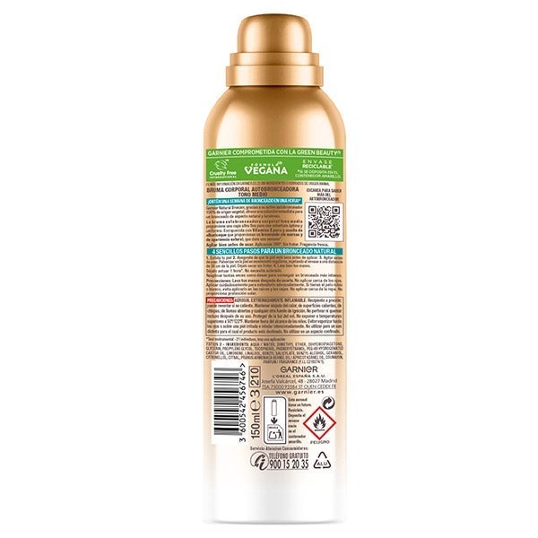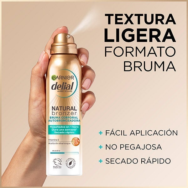 Natural Bronzer bruma autobronceadora para el cuerpo, enriquecida con aceite nutritivo de albaricoque, ofrece un tono bronceado natural, uniforme y sin marcas.