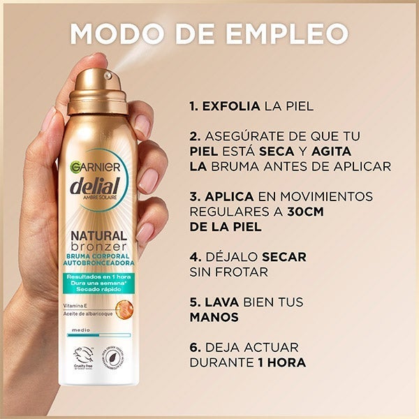 Aplicar la bruma al menos una hora antes del momento en que se desee lucir el bronceado.