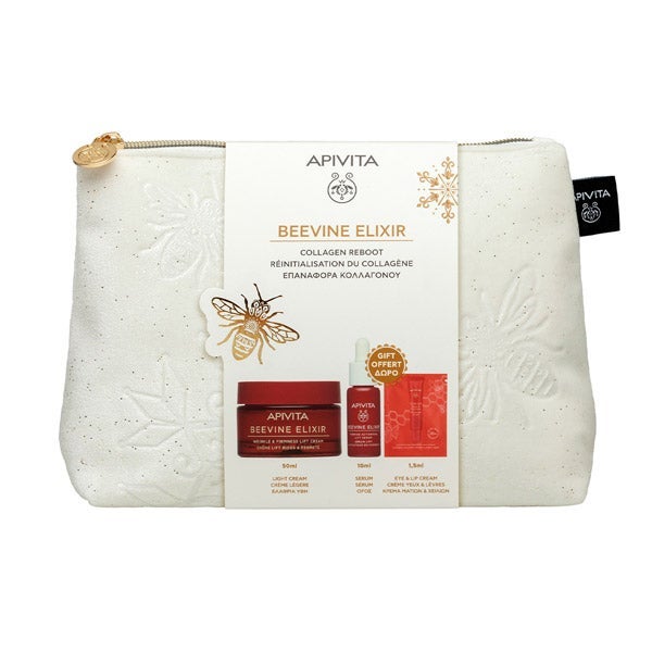 El Set de Regalo Beevine Elixir de Apivita reúne tres artículos fundamentales para una rutina facial diaria centrada en mantener la piel cuidada. Incluye la Crema Lift Arrugas & Firmeza, que aporta hidratación, nutrición y ayuda a suavizar las líneas de expresión, al mismo tiempo que refuerza la firmeza y la elasticidad del rostro. También incorpora el Sérum Lift Activador de Firmeza, que ofrece un efecto tensor rápido y realza la luminosidad cutánea. Finalmente, el Contorno de Ojos y Labios Lift trata las zonas más sensibles, alisando y tonificando la piel para un aspecto más radiante. Está pensado especialmente para mujeres que buscan combatir los signos de las arrugas.