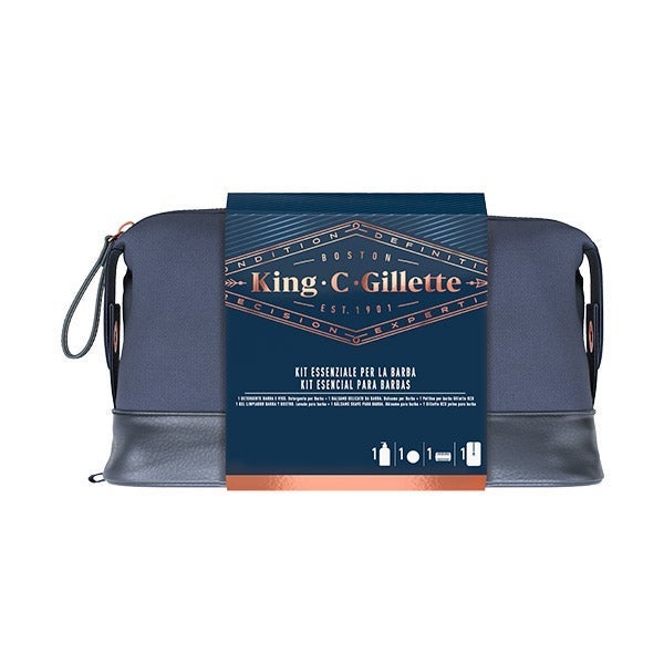 Obsequia King C. Gillette Beard Essentials Bag Set, que incluye un gel limpiador para barba y rostro, un bálsamo, un peine para barba y un neceser con diseño sofisticado.