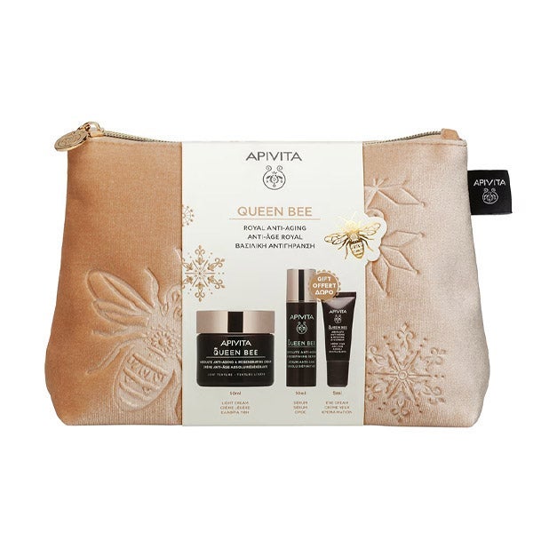 El Estuche Queen Bee de Apivita reúne una completa rutina de tratamiento antiedad regenerador. Incluye una Crema Antiedad Absoluto de textura ligera con jalea real de liberación controlada, creada para suavizar las arrugas, mejorar la firmeza, recuperar la densidad y el volumen cutáneo, además de aportar hidratación y uniformidad al tono de la piel. También incorpora un Sérum Redensificante Antiedad Absoluto que ofrece un efecto lifting inmediato y redefine los contornos faciales. Finalmente, el Contorno de Ojos Revitalizante Antiedad Absoluto contribuye a reducir líneas de expresión y arrugas marcadas, eleva los párpados y atenúa bolsas y ojeras.