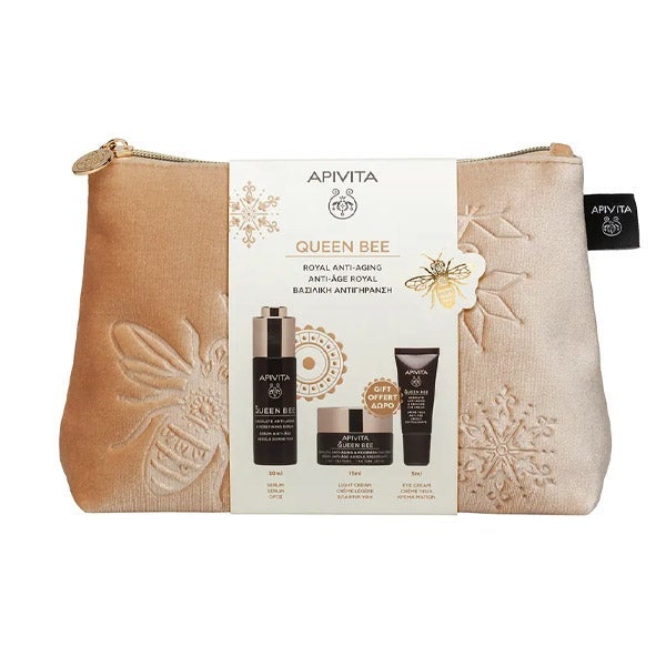El Cofre Queen Bee de Apivita es una selección premium dedicada al tratamiento facial. Contiene el QUEEN BEE Sérum Redensificante Antiedad Absoluto con Jalea Real de liberación progresiva, diseñado para suavizar las arrugas, mejorar la firmeza cutánea, remodelar el contorno del rostro y devolverle volumen y densidad a la piel, aportando un efecto tensor al instante y una hidratación duradera. También integra la QUEEN BEE Crema Antiedad Absoluto, de textura ligera, que comparte beneficios con el sérum, centrada en la disminución de líneas y en optimizar la renovación celular. El estuche se completa con el QUEEN BEE Contorno de Ojos Revitalizante Antiedad Absoluto, formulado para atenuar las líneas finas y arrugas marcadas, reafirmar los párpados y reducir tanto bolsas como ojeras, mientras aporta hidratación y energía a la delicada área del contorno ocular.