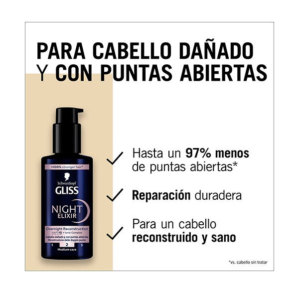 Creado especialmente para reparar el cabello debilitado y con puntas abiertas, Night Elixir Reconstrucción integra el sistema HaptIQ System junto con el Complejo Iónico, que actúan generando microenlaces para fortalecer la fibra capilar y disminuir hasta un 97% las puntas abiertas+ (* en comparación con cabellos sin tratamiento).