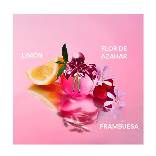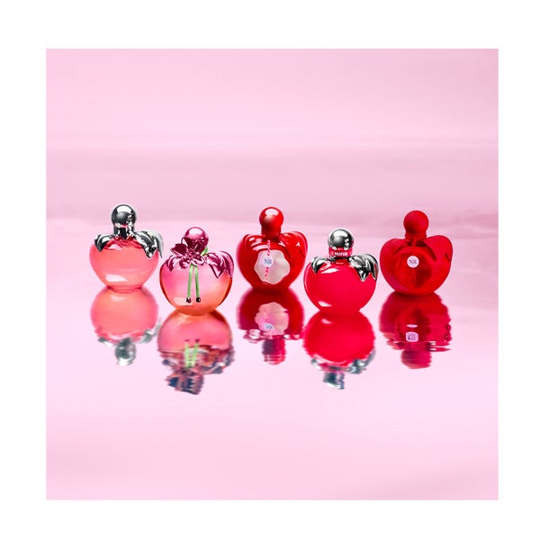 El emblemático frasco en forma de manzana característico de Nina se reinventa en un tono rosa metálico, adornado con una delicada joya floral extraíble que puede lucirse como un elegante complemento. Su caja sorprende con una ilustración encantadora y un mensaje secreto escondido en el interior.
