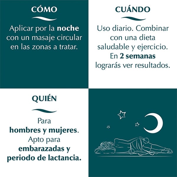 Es una crema reductora de noche con triple efecto intensivo: quemagrasa, drenante y anticelulítico. Contribuye a reducir la grasa localizada, combate su formación, favorece la eliminación de líquidos y toxinas y ofrece una sensación de relajación agradable gracias a su textura fresca y ligera que acompaña el descanso nocturno.