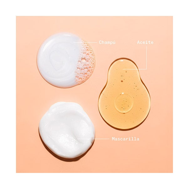 Distribuye el champú sobre el cabello húmedo, masajea hasta formar espuma y enjuaga con abundante agua. Con el cabello ya limpio, aplica la mascarilla y déjala actuar durante 5 minutos.