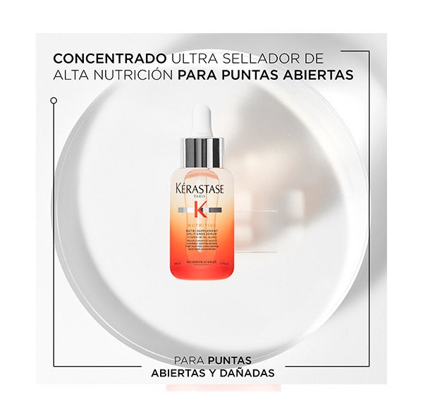 Nutri-Supplement Split-Ends Serum de Kérastase es un sérum altamente nutritivo y sellador intensivo diseñado para el cabello seco con puntas abiertas. Este tratamiento especializado incorpora polímeros que combaten la sequedad, ayudando a cerrar y proteger las puntas frágiles para evitar que se abran. Además, aporta nutrientes fundamentales que refuerzan la acción nutritiva y fortificante de su fórmula.