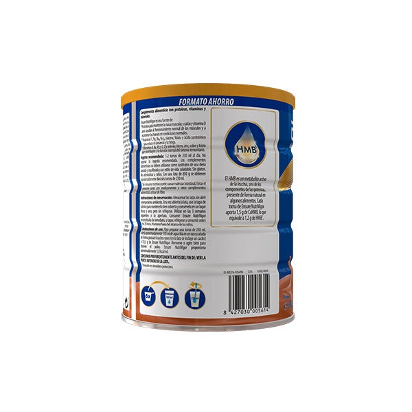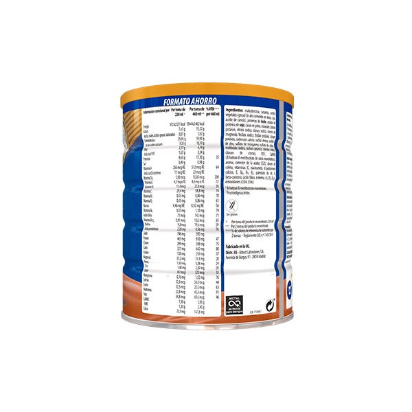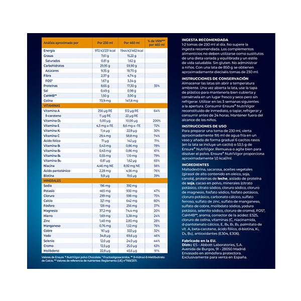 Maltodextrina, sacarosa, aceites vegetales (girasol de alto contenido en oleico, soja, canola), proteínas de leche, aislado de proteína de soja, cacao en polvo, minerales (citrato potásico, citrato sódico, cloruro sódico, cloruro de magnesio, fosfato sódico, fosfato potásico, cloruro potásico, carbonato cálcico, sulfato ferroso, sulfato de zinc, sulfato de manganeso, sulfato de cobre, molibdato sódico, yoduro potásico, selenito sódico, cloruro de cromo), FOS*, CaHMB**, aroma, corrector de acidez: E525, cloruro de colina, vitaminas (C, niacinamida, d-pantotenato cálcico, E, B6, B1, B2, palmitato de vit. A, beta-caroteno, ácido fólico, d-biotina, K1, D3, B12), antioxidantes (304, E306).