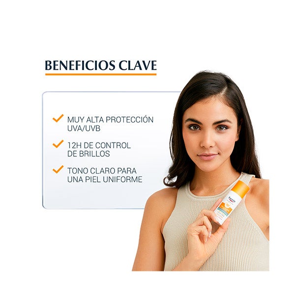 Fotoprotector con color claro FPS 50+ diseñado para responder a las exigencias particulares de la piel grasa o con tendencia acneica, proporcionando control del brillo hasta por 12 horas.