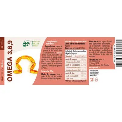 GHF Omega 3-6-9 un complemento alimenticio, enriquecido con ácidos grasos esenciales, indicado para mejorar la actividad cardiovascular, reducir la tensión arterial y controlar el colesterol en sangre. Los ácidos grasos esenciales también son altamente beneficiosos en procesos hormonales, controlando la liberación de hormonas segregadas por la glándula pituitaria, el tiroides y la glándula adrenal. Aliviará síntomas asociados a la menstruación y menopausia.
