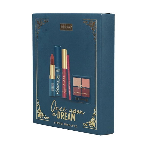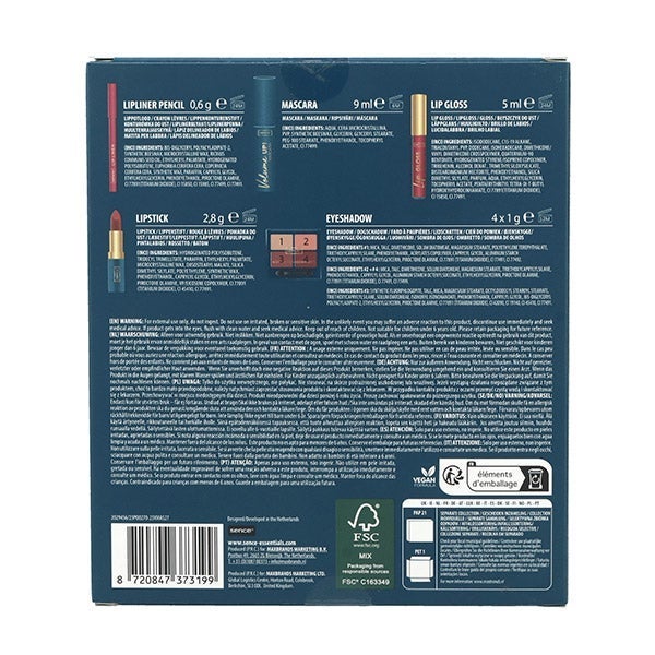 Contiene una barra de labios en tono rojo, una máscara de pestañas que aporta volumen, un brillo de labios color cereza, un lápiz de ojos de larga duración y una paleta de sombras de ojos con cuatro matices rojizos.